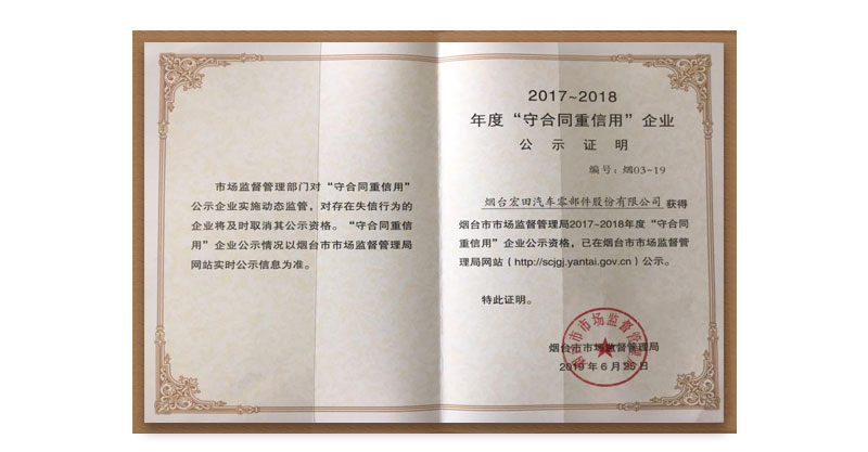 宏田獲得2017-2018年度 “守合同重信用企業(yè)”